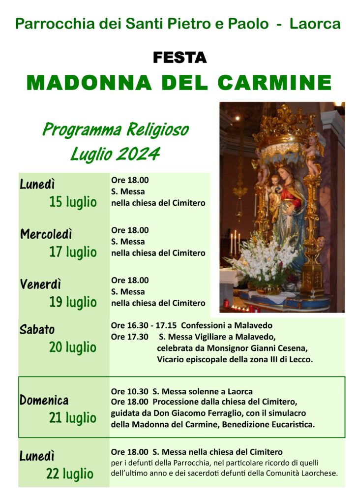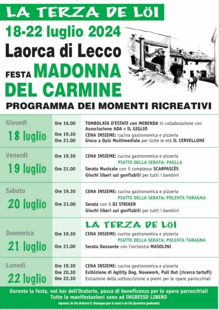 La “Festa patronale di Laorca terza de lòi” è un evento tradizionale ricco di storia e cultura, celebrato con grande fervore nella comunità di Laorca. Questa festa si svolge nella terza settimana di luglio e onora la Madonna del Carmine, una figura molto venerata nella regione. Gli abitanti di Laorca e dei dintorni si riuniscono per partecipare a una varietà di attività che includono messe solenni, processioni religiose, e momenti di convivialità come pranzi e cene comunitarie. La festa offre anche intrattenimento per tutte le età, con concerti, spettacoli teatrali dialettali, giochi e attività ludiche. È un momento in cui la comunità si unisce per celebrare la propria fede e le proprie tradizioni, rafforzando il senso di appartenenza e di identità locale.