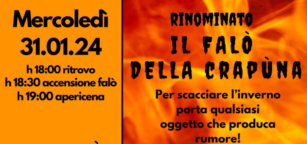 Mercoledì 31 gennaio ore 18.00 Ritrovo in oratorio a Laorca per Il Falò della Crapuna. Ore 18.30 Accensione falò. Portare qualsiasi oggetto che produca rumore. Segue Apericena. La Giubiana è una tradizione brianzola e piemontese consistente nel mettere al rogo il pupazzo di una vecchia che rappresenta i mali dell’inverno e dell’anno trascorso. La festa si […]