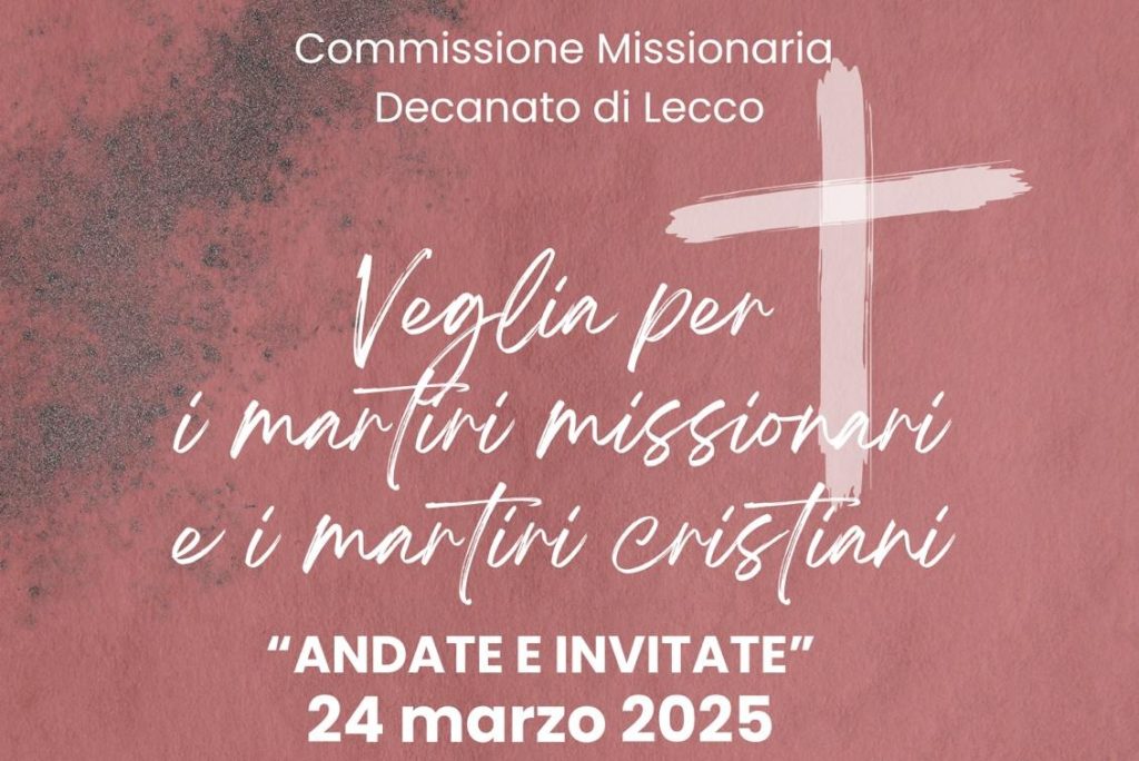 La Veglia per i martiri missionari e i martiri cristiani “ANDATE E INVITATE” sarà il 24 marzo 2025 alle ore 20.45 Chiesa Frati Cappuccini di Lecco. Lo slogan scelto da Missio Giovani è “Andate e invitate”, in riferimento al brano del Vangelo di Matteo che ci ha accompagnato durante tutto l’ottobre missionario. Nella parabola raccontata da […]
