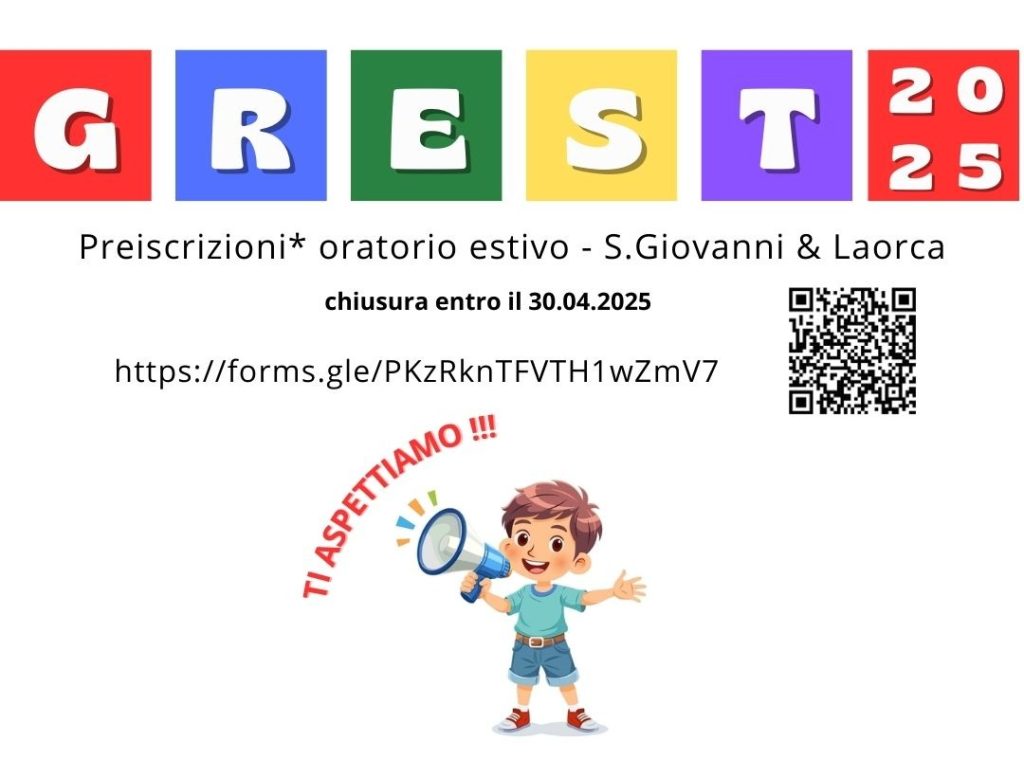 Per verificare come poter soddisfare le esigenze della comunità in base alle forze disponibili. L’oratorio estivo 2025 negli oratori di Laorca e S.Giovanni dura 4 settimane (9/06 – 4/07) mattina e pomeriggio (dalle 8.30 alle 17).I ragazzi/e delle medie a Laorca, i ragazzi/e delle elementari a S.Giovanni. L’accesso al GREST 2025 (il tema sarà svelato […]