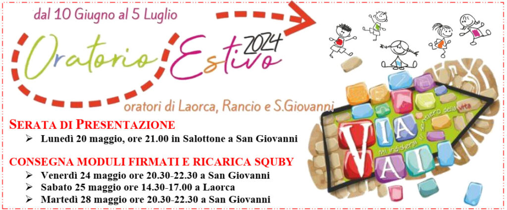 La serata di presentazione dell’oratorio Estivo 2024 sarà Lunedì 20 maggio, ore 21.00 in Salottone a San Giovanni. Aspettiamo tutti gli interessati.Possiamo partire per un viaggio, anzi un pellegrinaggio, che condurrà ragazzi e ragazze a capire che nella vita siamo affiancati dalla presenza del Signore Gesù che ci guida e ci indica il sentiero. “ViaVai […]