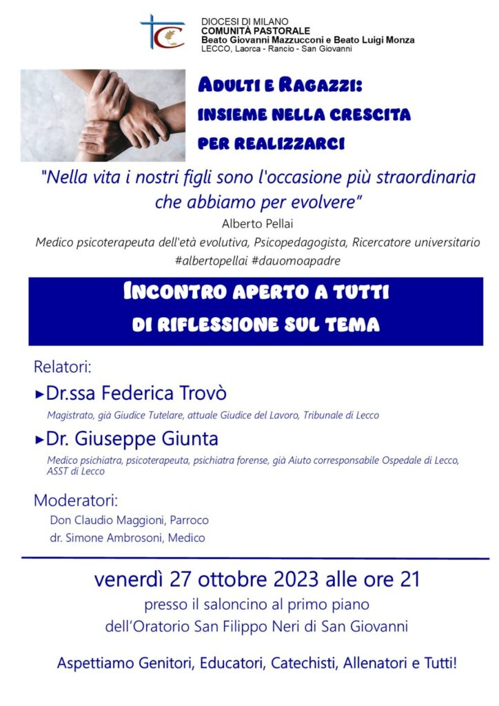 Venerdì 27 ottobre 2023alle 21 presso il saloncino al primo piano dell’Oratorio San Filippo Neri di San Giovanni sono invitati genitori, educatori, catechisti, animatori, tutti all’incontro formativo sul tema aperto a tutti: Adulti e ragazzi: insieme nella crescita per realizzarci. “Nella vita i nostri figli sono l’occasione più straordinaria che abbiamo per evolvere” Alberto Pellai, […]