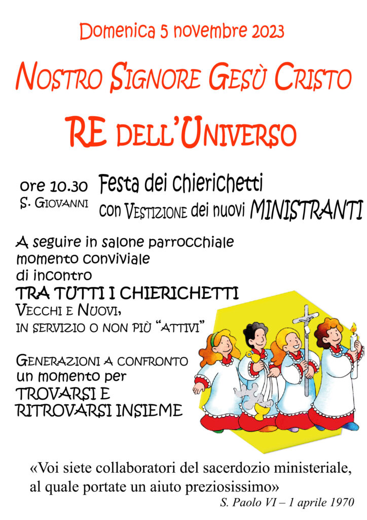 Domenica 5 novembre in occasione della festa di Nostro Signore Gesù Cristo Re dell’Universo alle ore 10:30 a San Giovanni si svolgerà la Festa dei Chierichetti con vestizione dei nuovi Ministranti. A seguire nel salone parrocchiale momento conviviale di incontro tra tutti i chierichetti vecchi e nuovi in servizio e non più attivi.